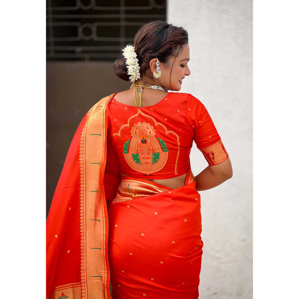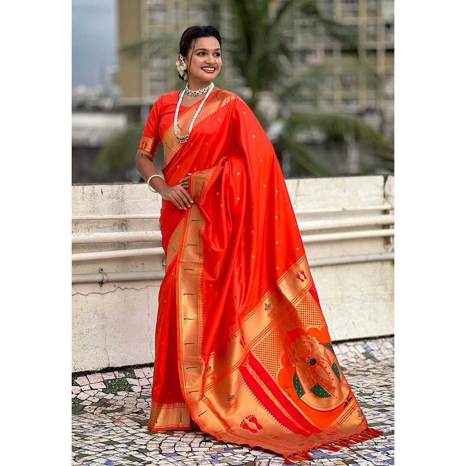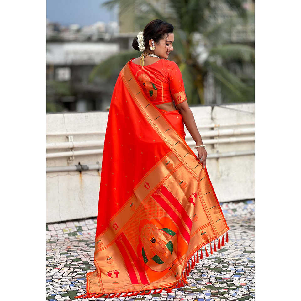 Orange Zari Woven Mahalaxmi God Paithani Silk Saree Elegant Evening Dress