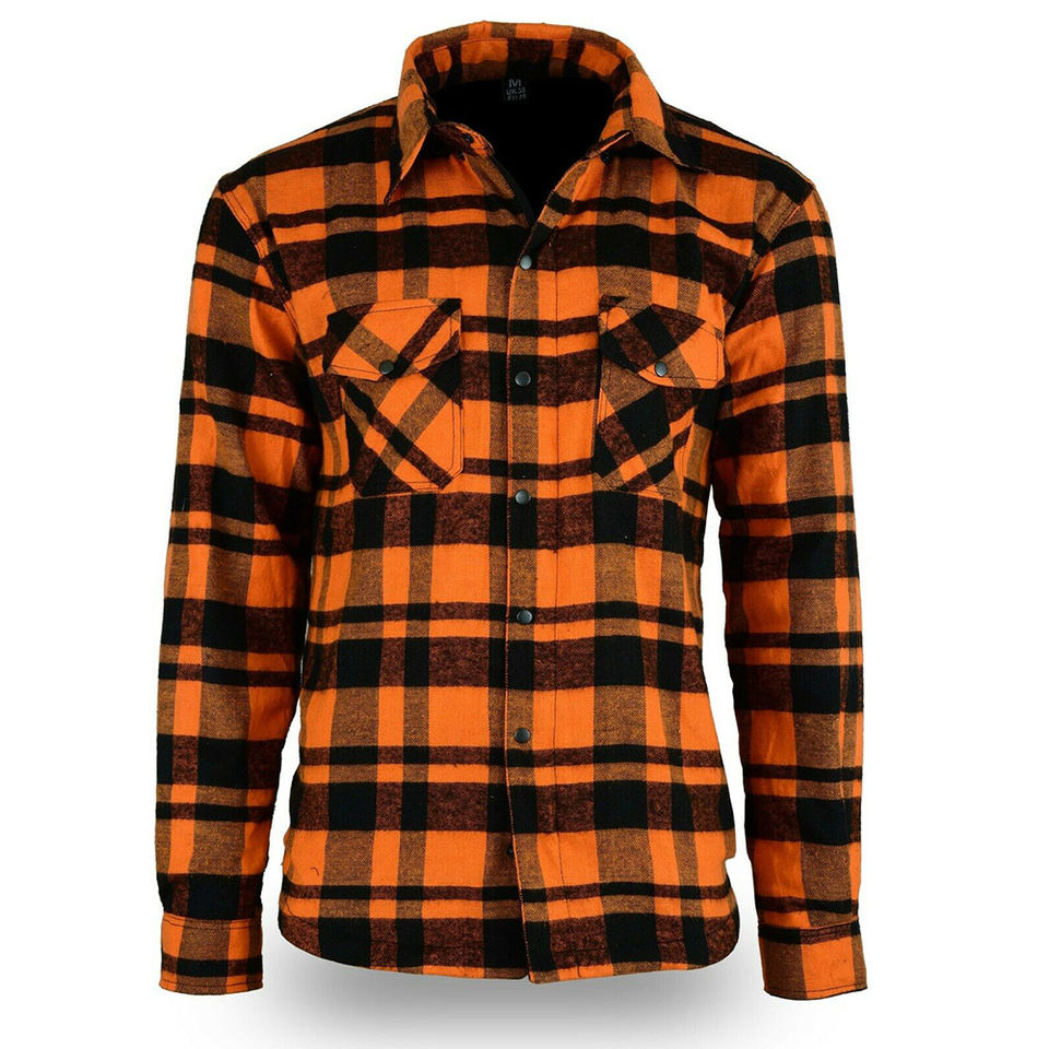 Orange and black plaid flannel shirt for casual outings with CE-certified motorcycle shirt with armor and protective lining