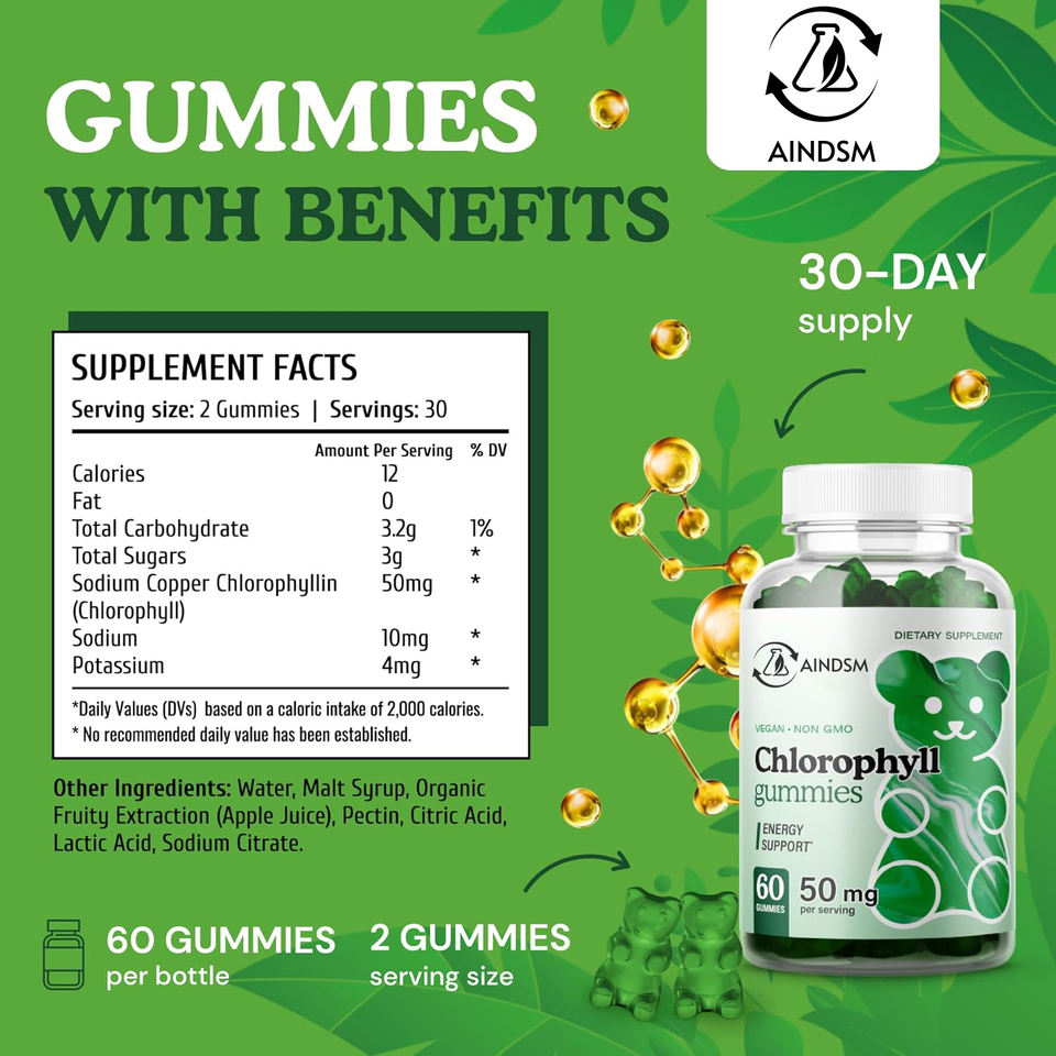 Gommes à la chlorophylle biologique, stimulent l'énergie, favorisent la digestion, antioxydants végétaliens, gommes à la chlorophylle