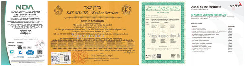 Certificats:ISO, halal, casher, certificat d'analyse (COA), certificat alimentaire, sans OGM, FDS (fiche de données de sécurité)