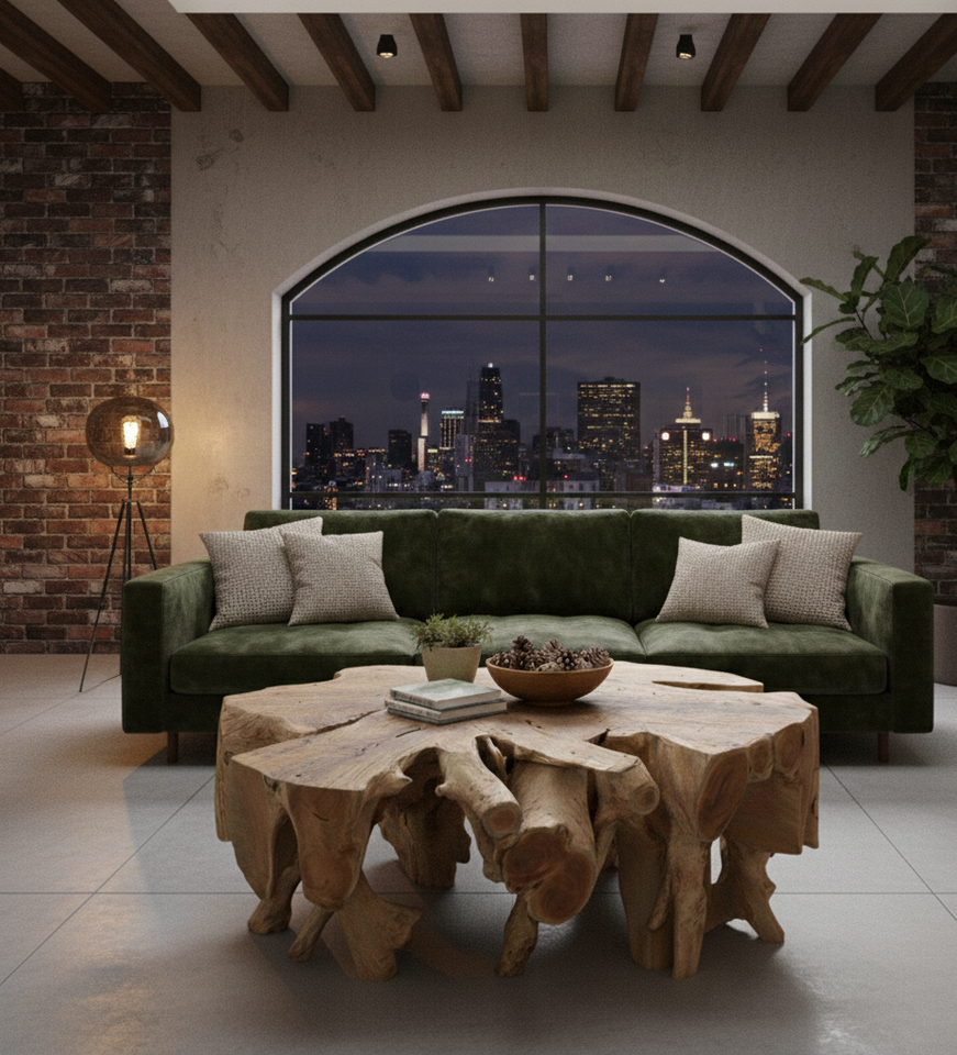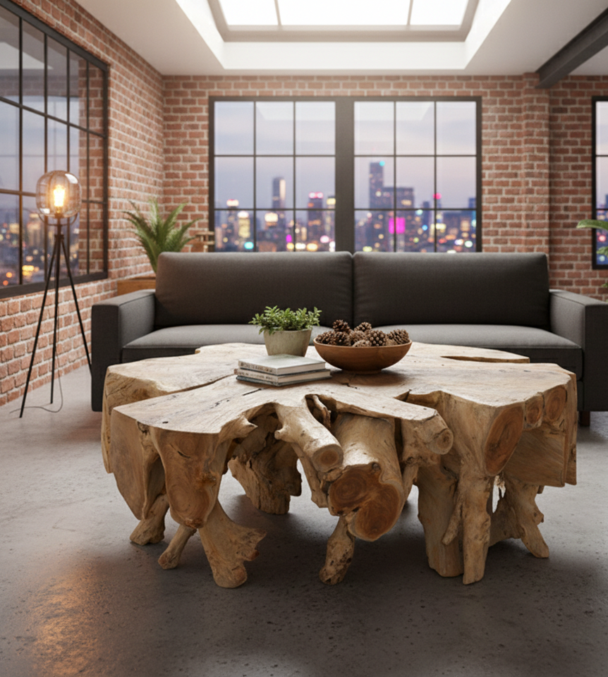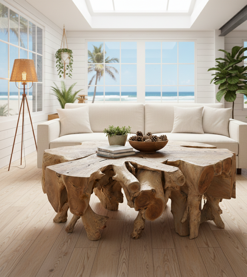 Table basse en racine de teck bio, fabriquée en bois de teck massif avec plateau en verre, offrant durabilité, valeur artistique et élégance.