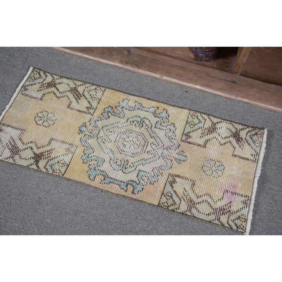 Tapis Turc Vintage Oriental 1.3x 2.8ft Jaune Bleu Patchwork Design Laine Latex Tissage Plat Salon Couloir Décorations