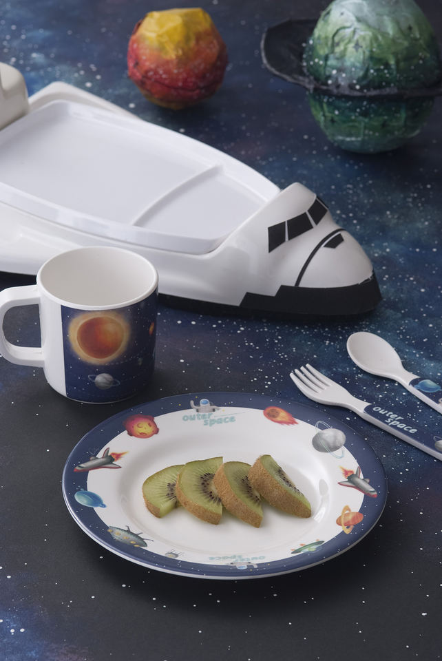 Assiette à dîner pour enfants en mélamine de forme spatiale originale, pour anniversaire d'enfant, assiette en forme de fusée
