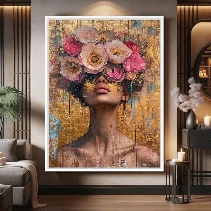 Peinture à l'huile sur toile originale, peinte à la main, moderne, réaliste, avec des pétales dorés, portrait floral abstrait, art mural