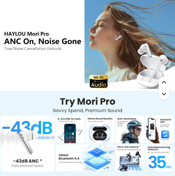 Écouteurs stéréo sans fil authentiques Haylou Mori Pro 43dB ANC & 6-mic ENC suppression du bruit BT5.4