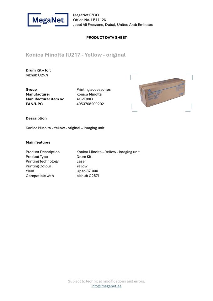 Unité d'imagerie originale Konica Minolta IU217Y - ACVF08D Authentique et neuve pour bizhub C257i