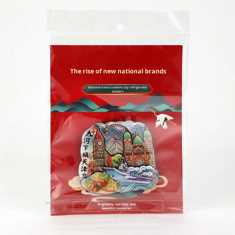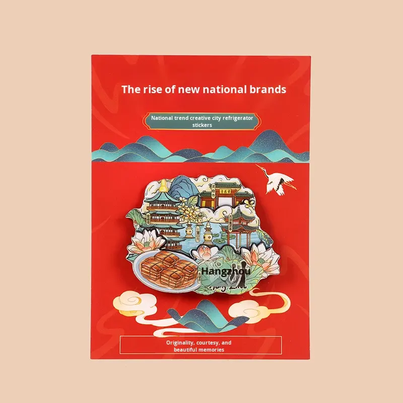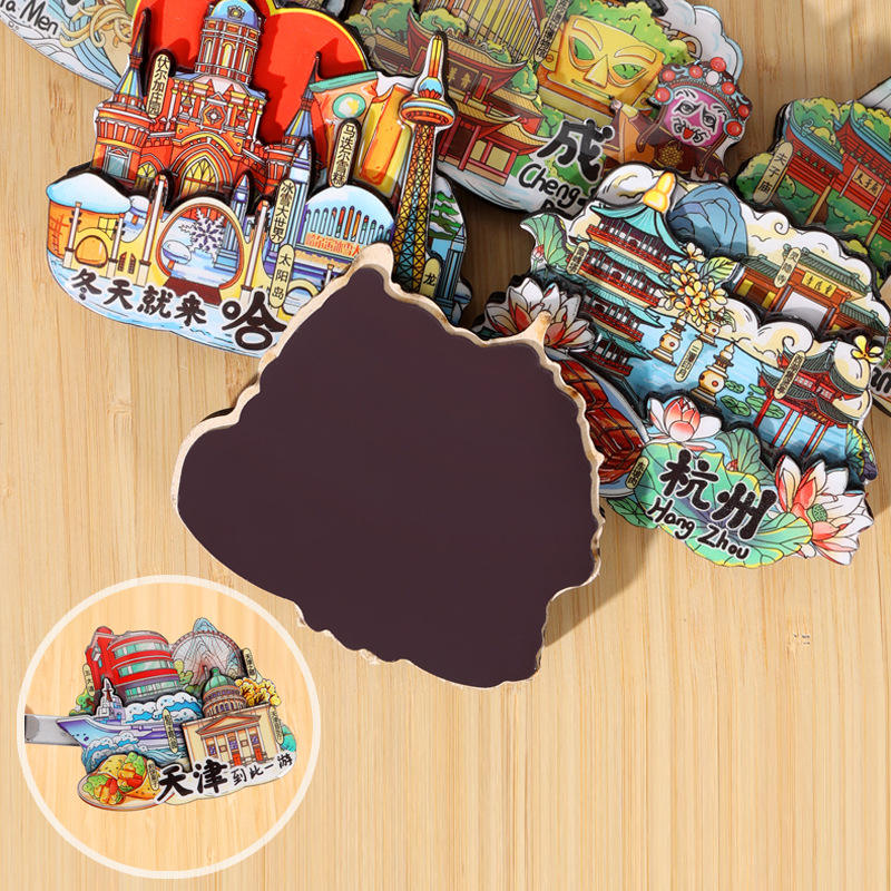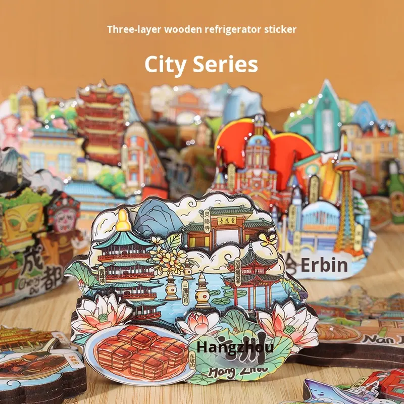 Autocollants magnétiques 3D époxy en bois à trois couches originaux scènes de ville découpées à l'emporte-pièce modernes attractions touristiques chinoises commémoratives
