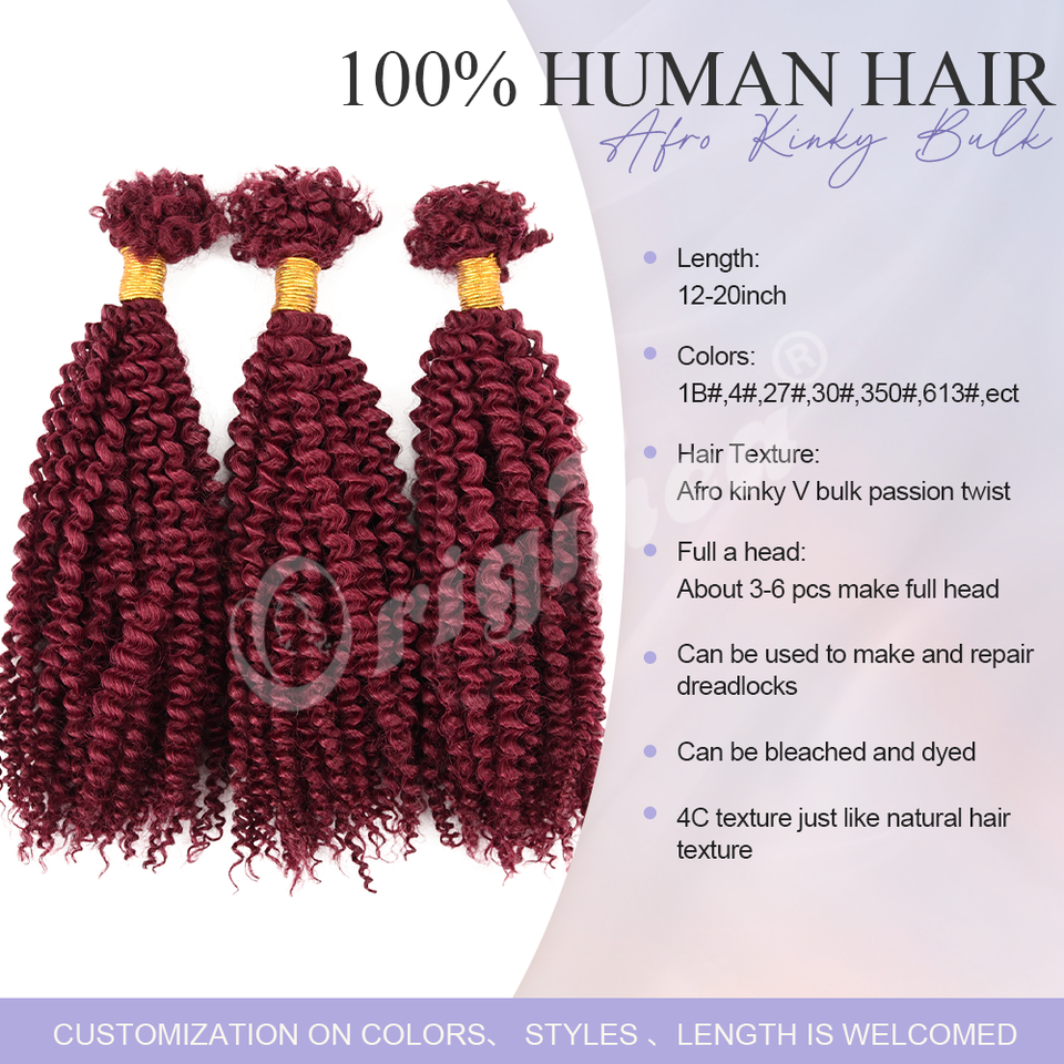 Originea Nouveauté Cheveux humains Remy Afro Kinky Ondulés Passion Bulk pour tresses au crochet et coiffures Spring Twist 50 grammes