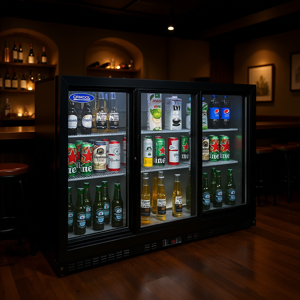 Réfrigérateur commercial Orikoool de 53 pouces, 3 portes vitrées, refroidisseur de bar arrière, capacité de 11,3 pieds cubes pour bière et vin