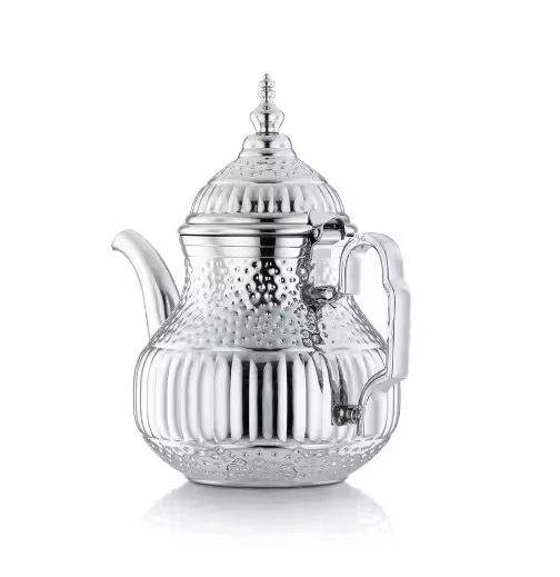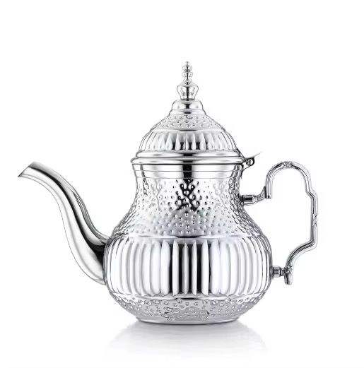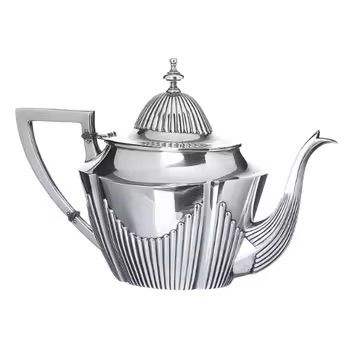 Théière en argent ornée, texture côtelée et à pois, bec courbé, poignée décorative, finition polie, vaisselle de cuisine vintage élégante