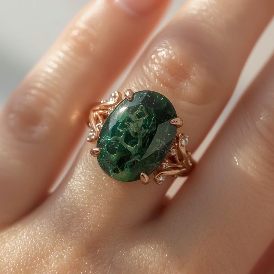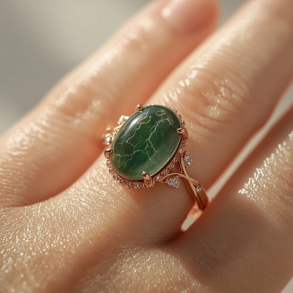 Ornate Vintage Inspired Fine Jewelry 14K Solid Gold Baguette Cabochon Ring with Diamond Halo for Weddings Parties & Anniversary