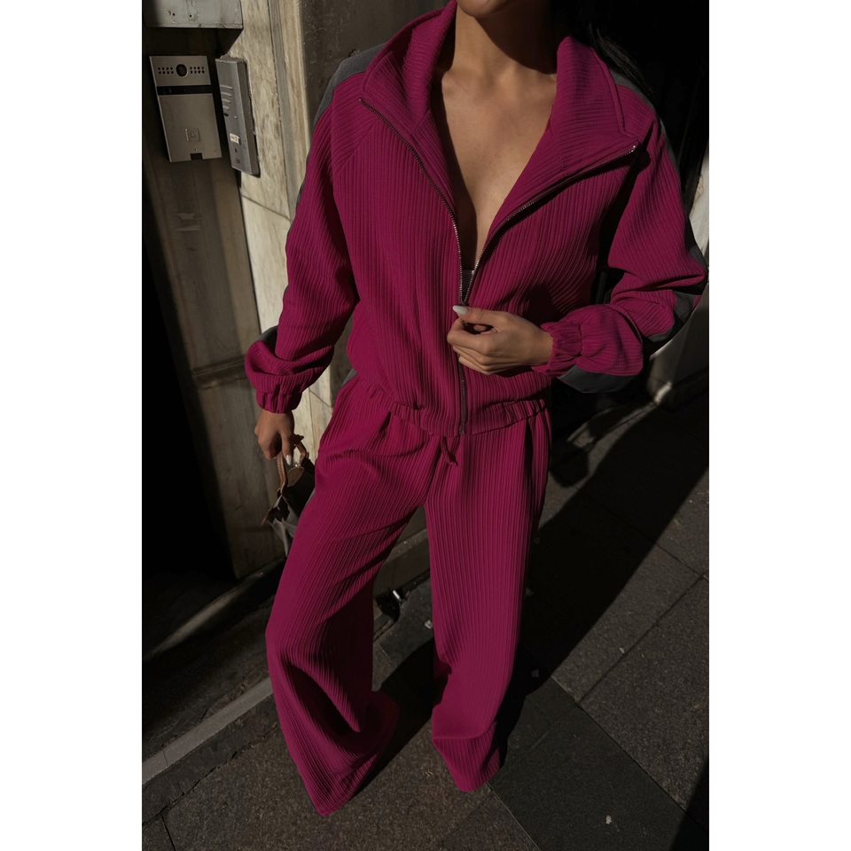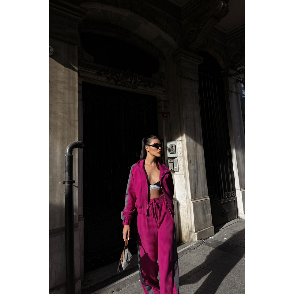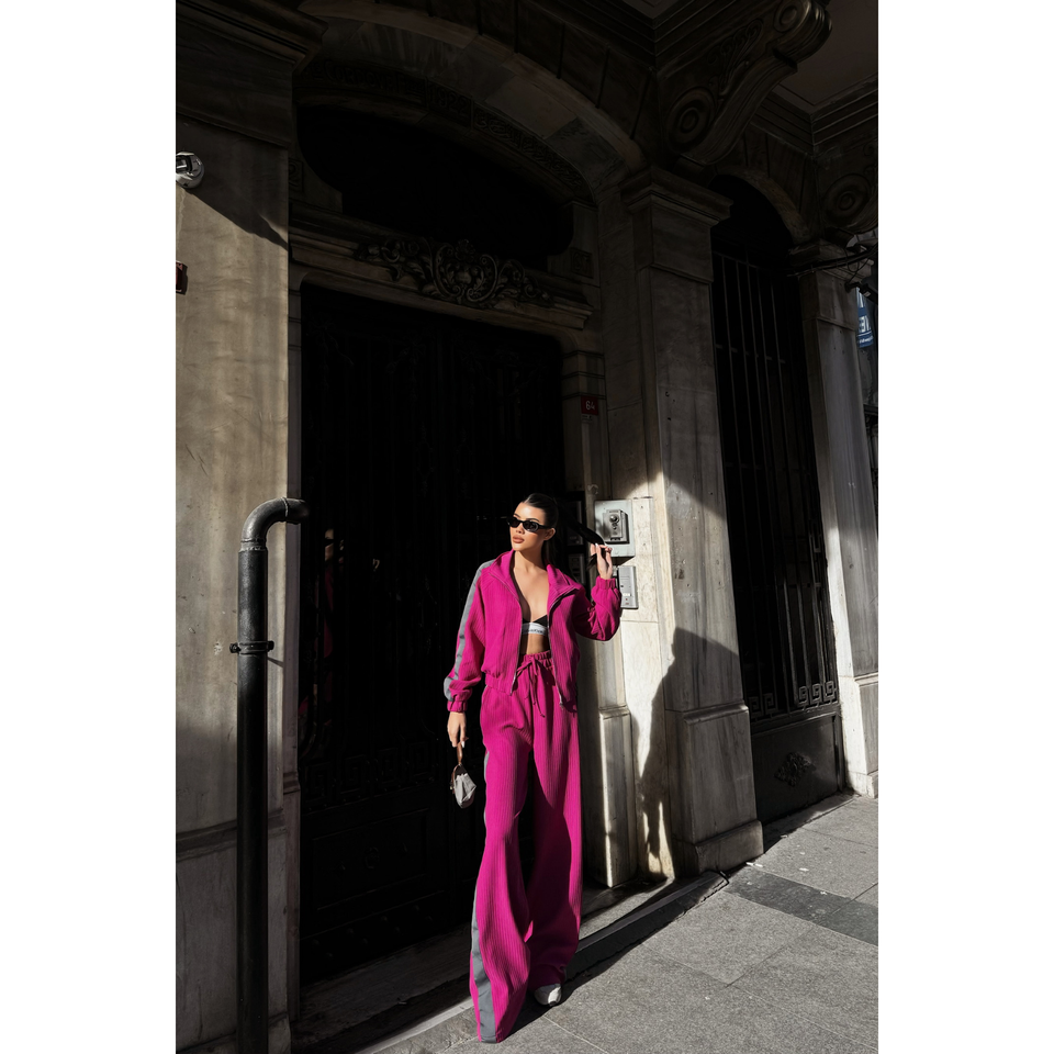 Ensemble de survêtement confortable à capuche ottoman en velours fuchsia et nylon imprimé avec des détails de bande latérale pour le jogging en hiver, taille XL
