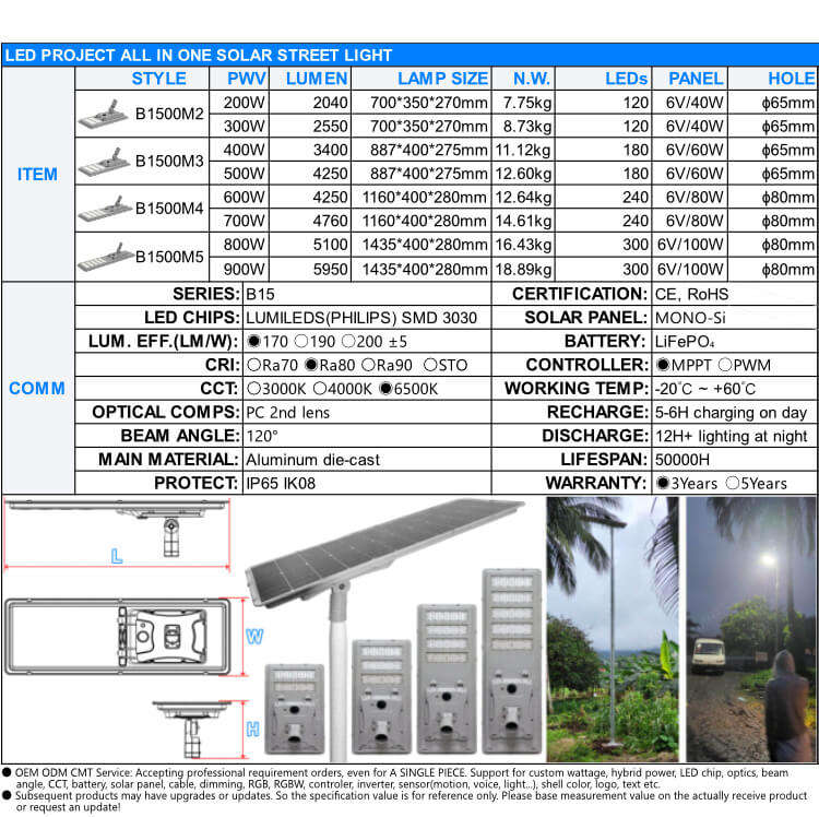Lampe LED solaire intégrée 50W-150W, éclairage extérieur pour cour publique