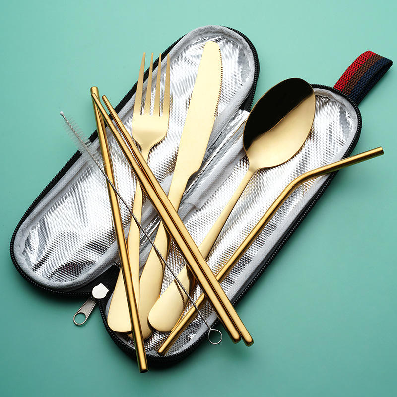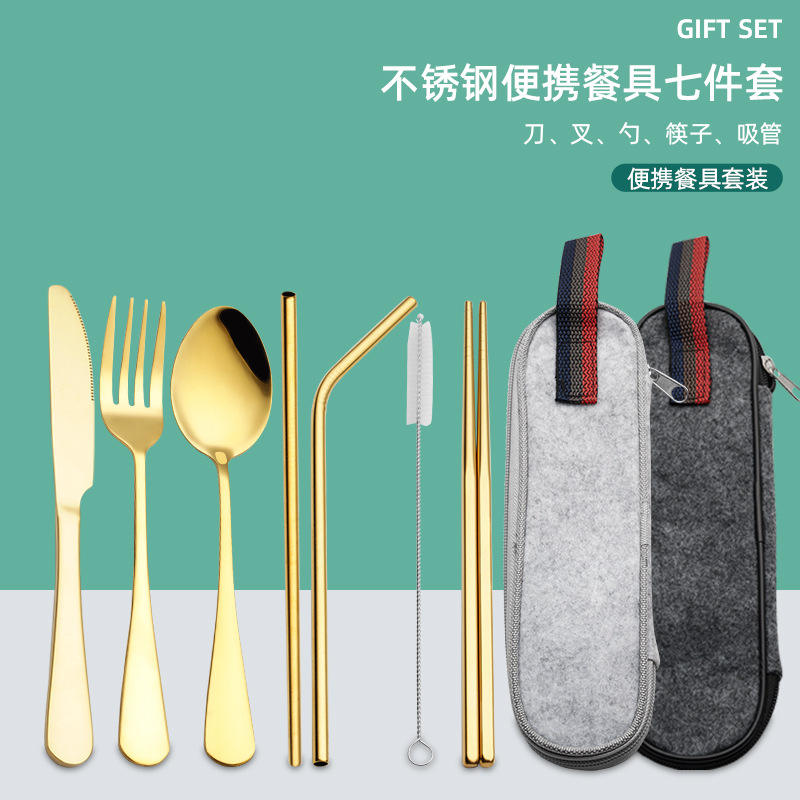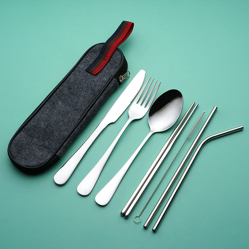 Batterie de cuisine en acier inoxydable pour camping en plein air cuillère fourchette baguettes brosse à paille 7 pièces batterie de cuisine ensemble portable avec boîte