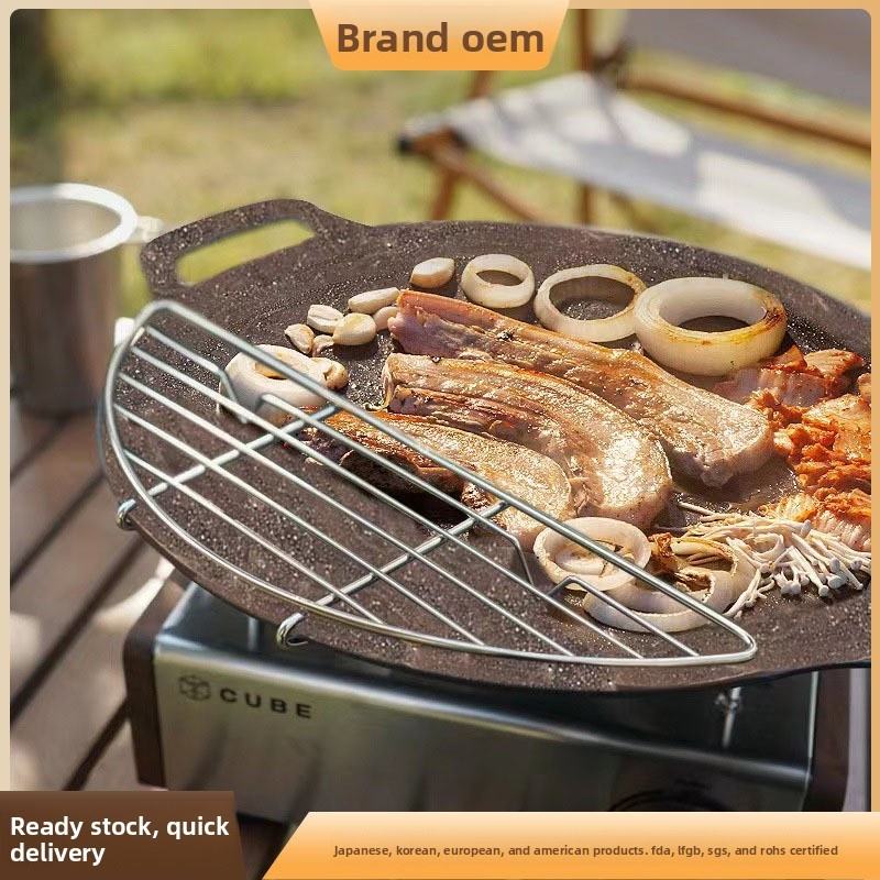 Plaque de cuisson en acier inoxydable pour camping extérieur, compatible gaz, avec poignée latérale et système de filtration d'huile