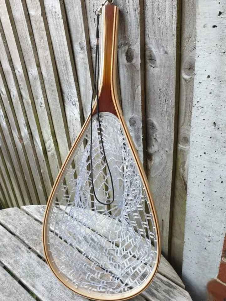 Outdoor Fly Fishing Landing Net with Wooden Frame and Rubber Mesh Hand-Cast Trout Catching Tool