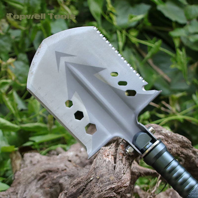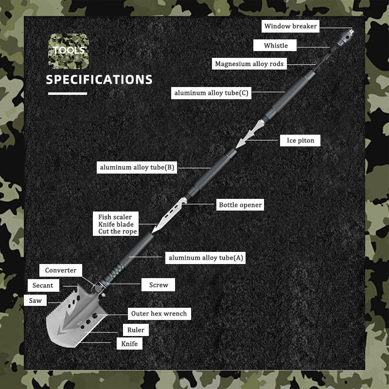 Pelle tactique pliable pour l'extérieur avec couteau Scie à étincelles Décapsuleur Sifflet de glace Piton pour le camping, la survie et la randonnée