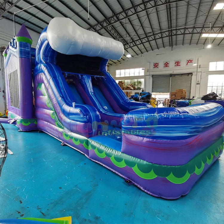Château gonflable violet pour enfants avec toboggan, capacité de 500 kg et garantie de 3 ans pour les événements