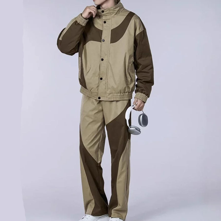 Ensemble coupe-vent patchwork extérieur avec veste zippée respirante et pantalon de jogging, couleur marron, en nylon réfléchissant