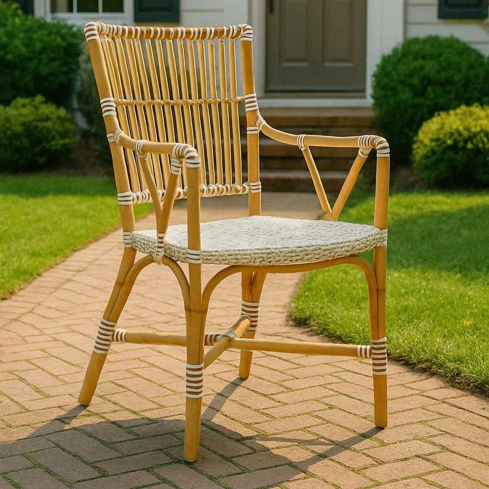 Chaise de salle à manger en rotin d'extérieur pour hôtels et parcs avec design vintage moderne, ton neutre et résistance à tous les temps