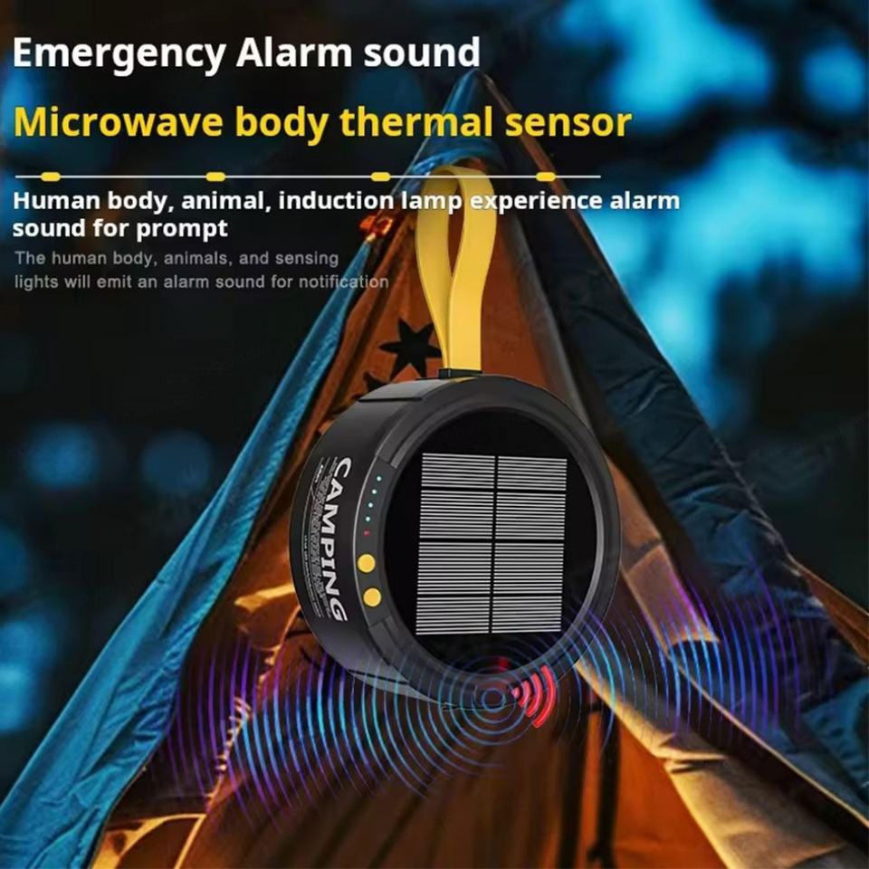 Lampe solaire de camping extérieure, guirlande lumineuse solaire, alarme d'urgence, lampe de tente solaire avec détection de mouvement humain