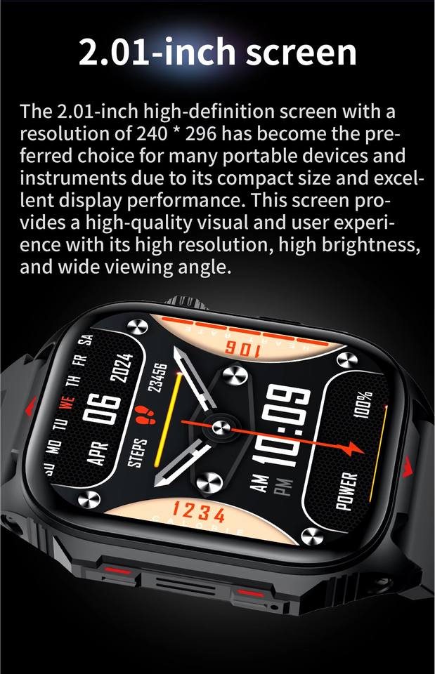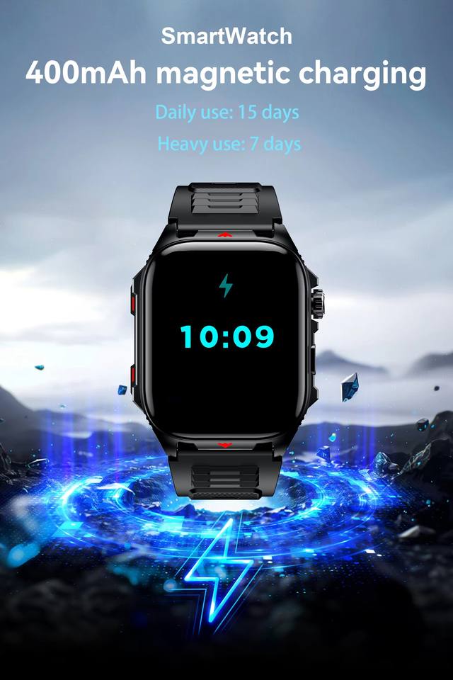 Montre connectée de sport pour homme, écran HD 2,0 pouces, lampe torche LED, batterie 400 mAh, fréquence cardiaque, étanche, appels Bluetooth