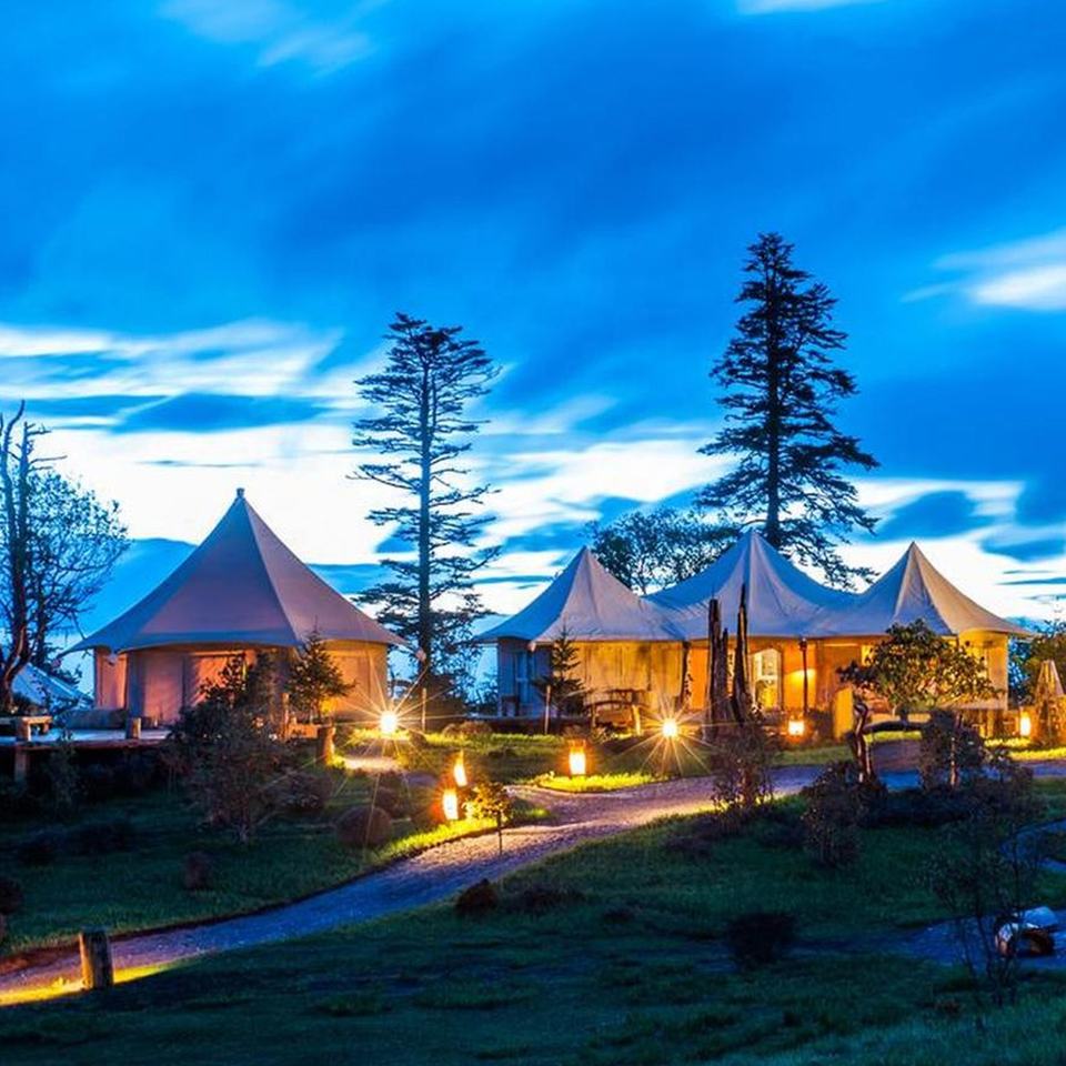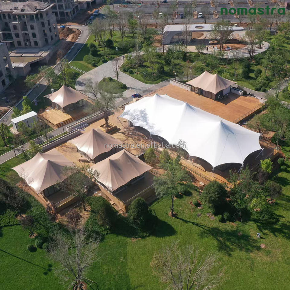 Tente de réception extérieure avec toit à arche haute et panneaux en aluminium coupe-vent, tente de glamping pour centre de services avec intérieurs personnalisés