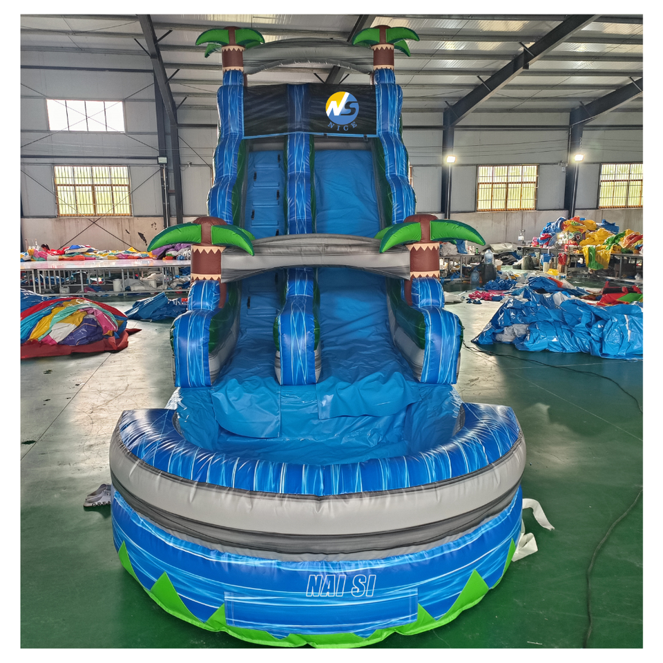 Toboggan aquatique gonflable tropical commercial d'extérieur avec piscine pour enfants et adultes, parc aquatique d'été pour location événementielle