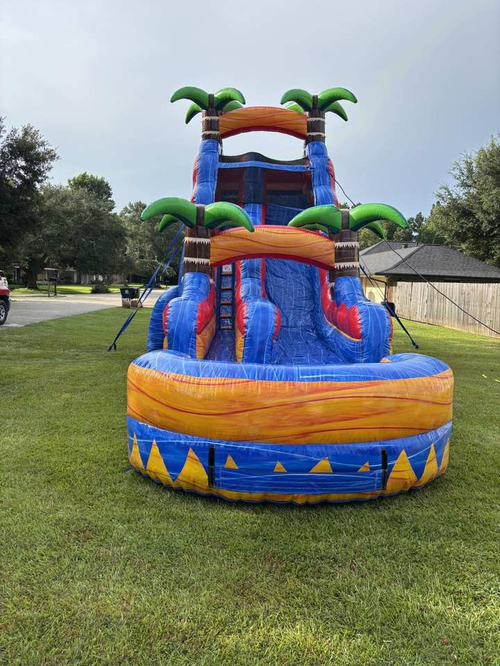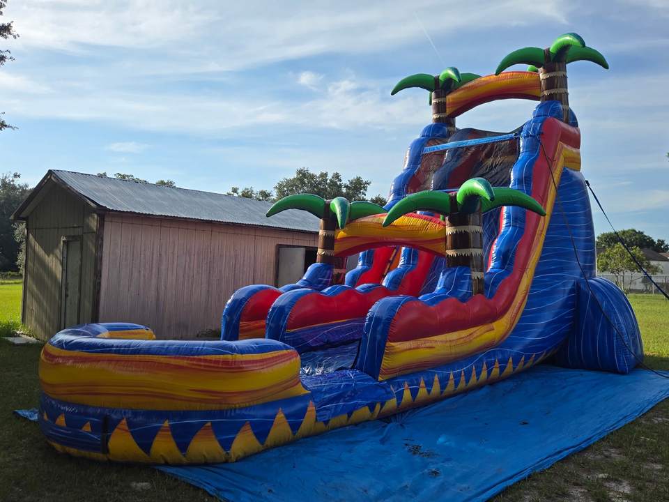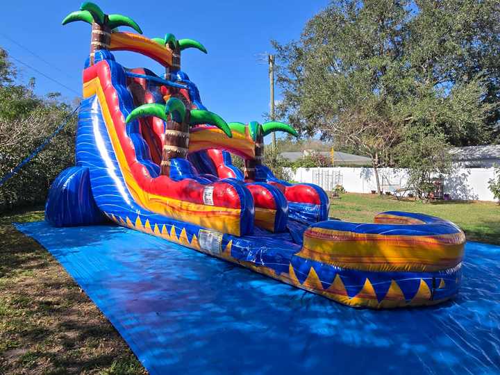Toboggan aquatique tropical Inferno en plein air, palmier, marbre bleu, aire de jeux gonflable avec piscine