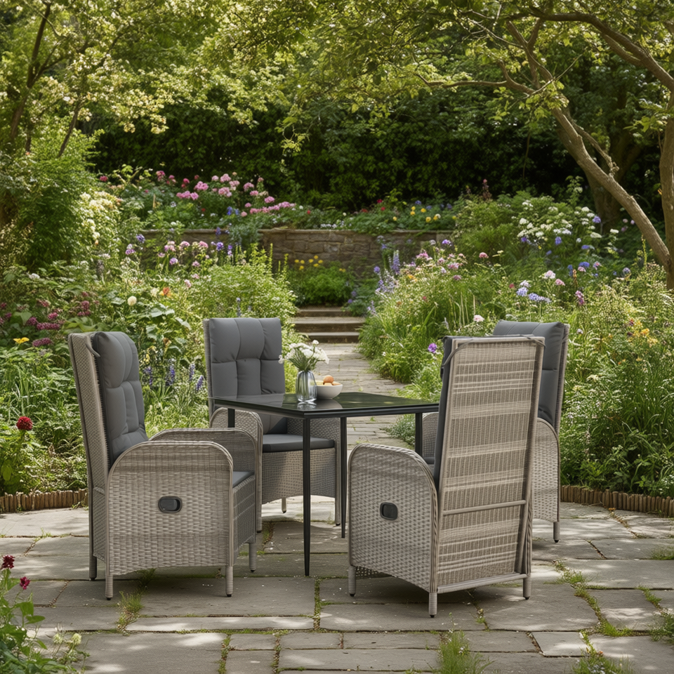 Ensemble de salle à manger de jardin en osier pour l'extérieur, 4 places, résistant aux intempéries, design contemporain, cadre gris avec coussins