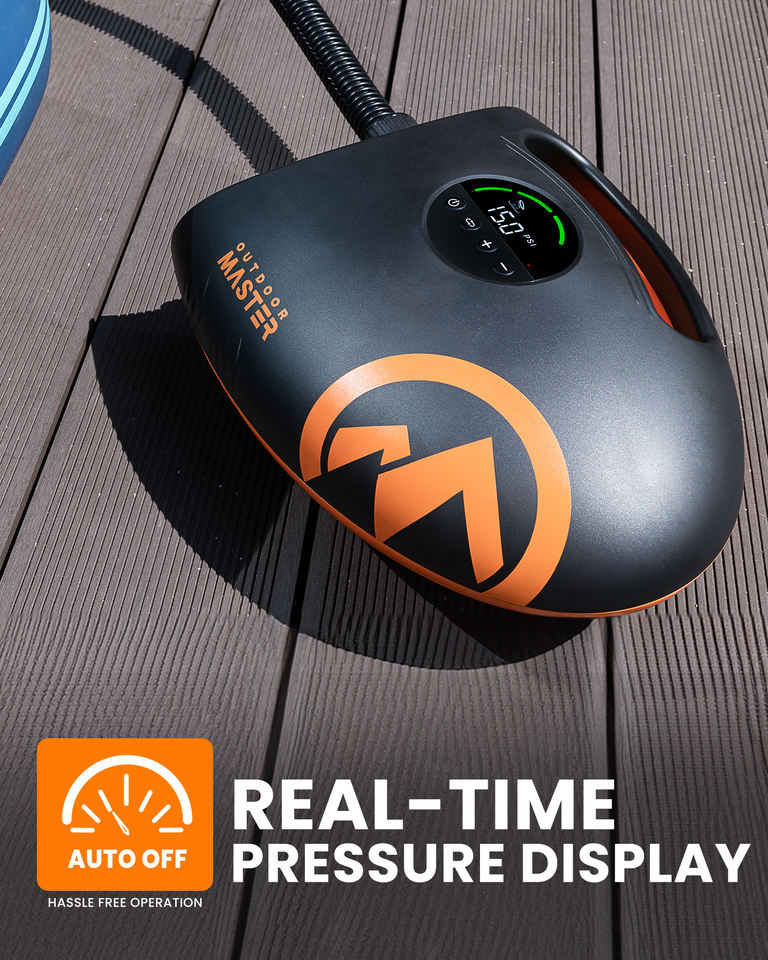 Pompe à air électrique portable rechargeable 12V OutdoorMaster Shark 2S 20PSI pour paddleboards, kayaks et voiles gonflables