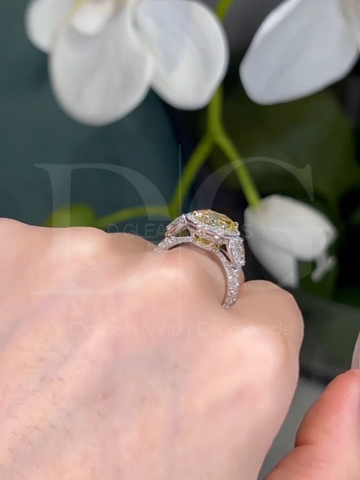 Bague ovale fantaisie jaune 7.40tcw Lab Grown Diamond Halo Three Stone | Bague de fiançailles à trois pierres certifiée IGI VVS-VS clarté