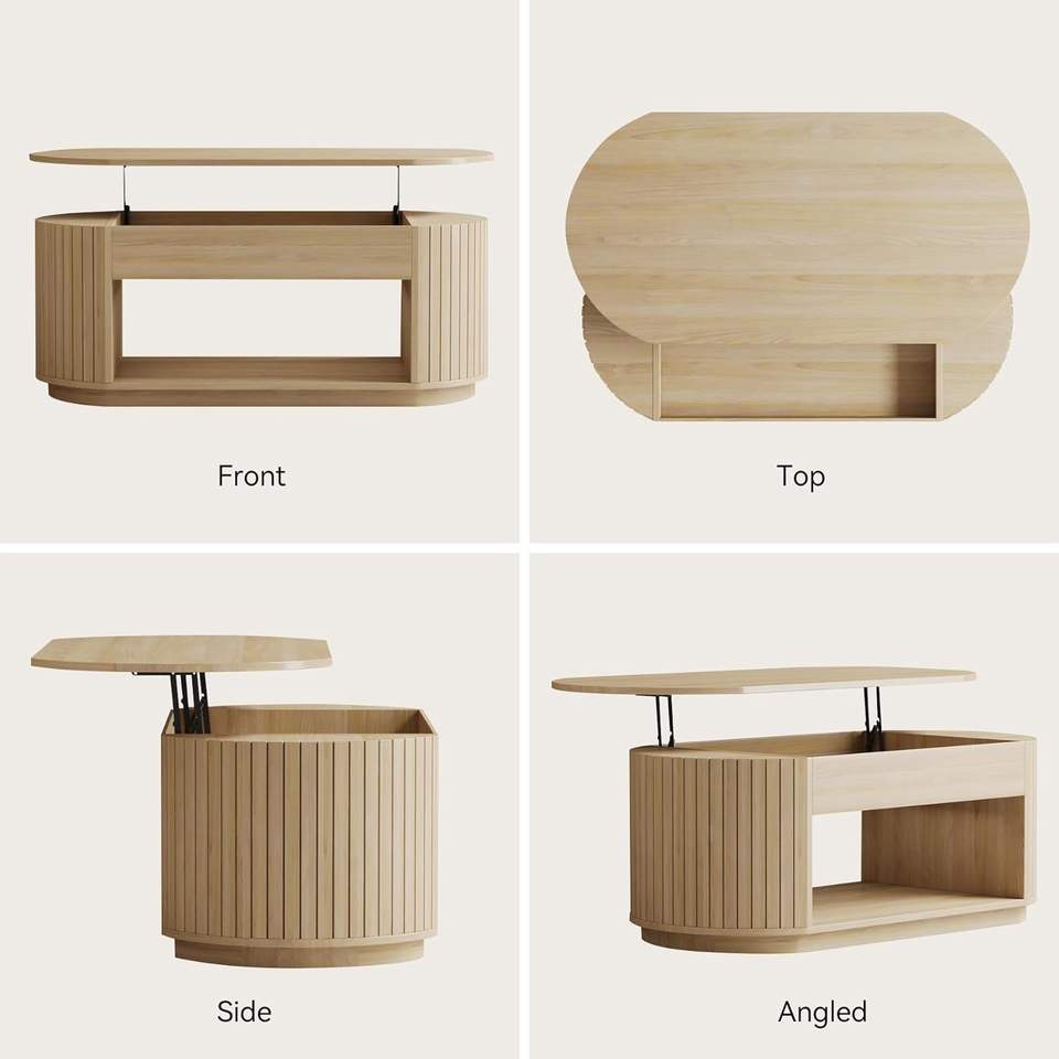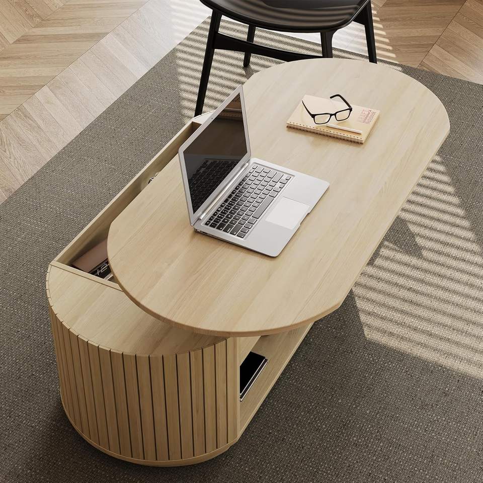 Table basse ovale avec plateau relevable, rangement dissimulé et panneaux latéraux cannelés