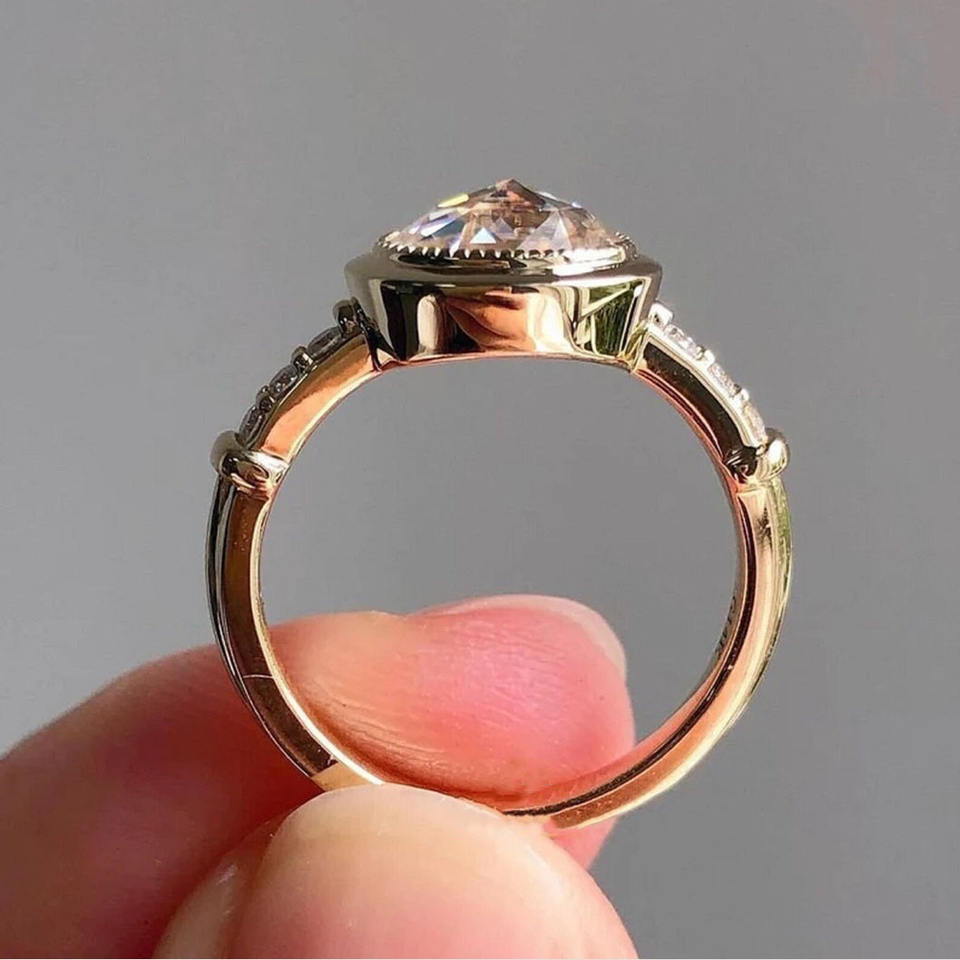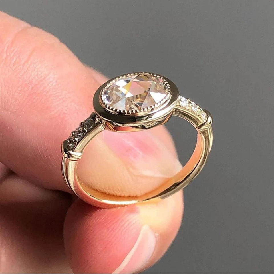 Bague de fiançailles minimaliste en argent sterling 925 avec moissanite ovale taille rose incolore sertie clos et détails pavé et milgrain