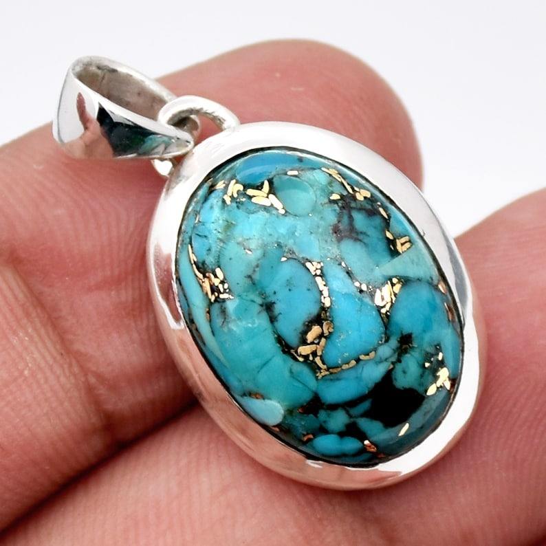 Pendentif solitaire en argent sterling plaqué rhodium/or avec pierre précieuse turquoise verte de forme ovale, serti en bélière, bijoux fins