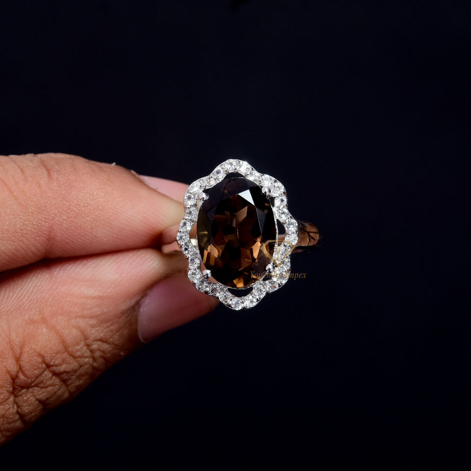Bague en pierres précieuses de quartz fumé naturel de forme ovale en argent sterling 925 bagues de mode de style chocolat fumé à la mode fournisseurs en gros