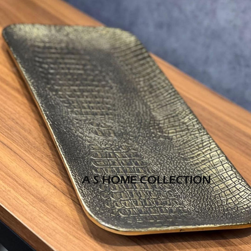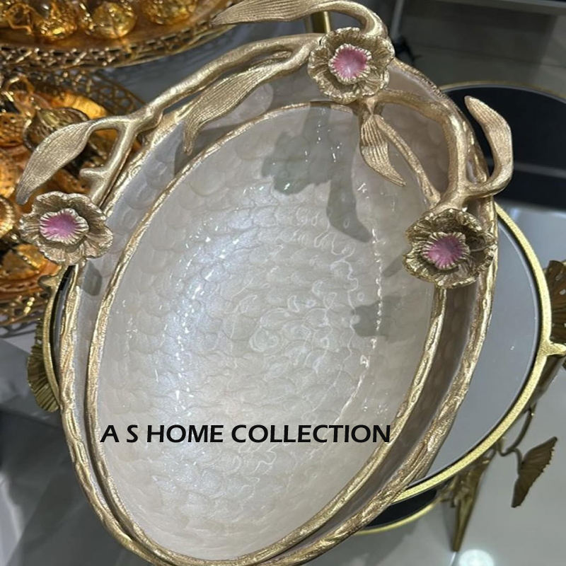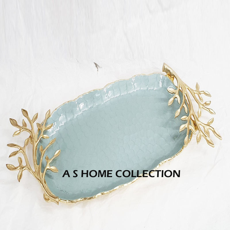Forme ovale et carrée en acier inoxydable laiton métal ensemble de 2 plateaux de service alimentaire nouvelle conception d'élégance plateau à poignée feuillue dorée
