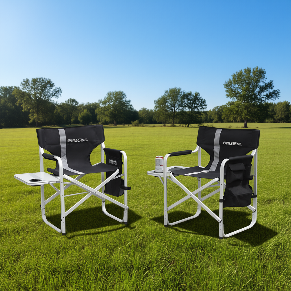 Chaise de directeur Ovalsolve, structure en aluminium, tissu polyester, chaise de jardin pliable légère avec table latérale et rangement