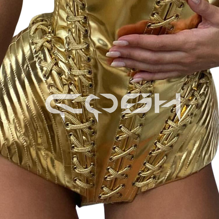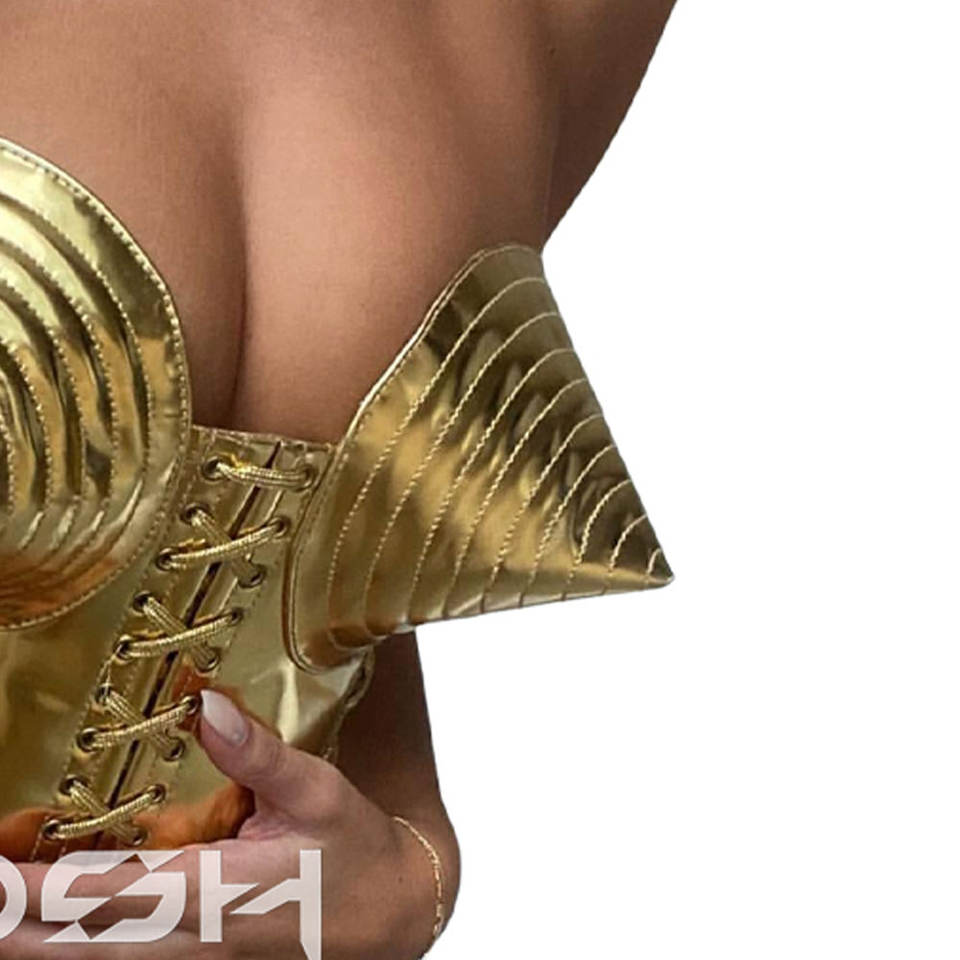 Corset Overbust en PVC métallisé doré brillant à bonnets pointus et à lacets sur le devant