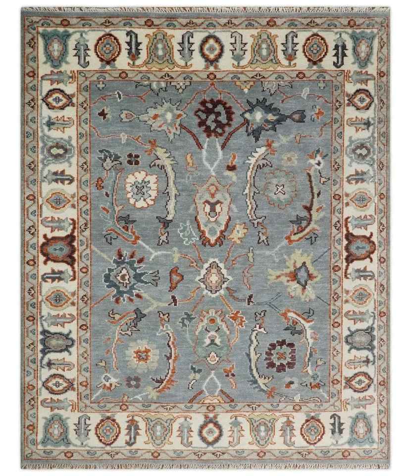 Tapis Oushak bleu clair, noué à la main, 244 x 305 cm, bordure ivoire, motifs floraux
