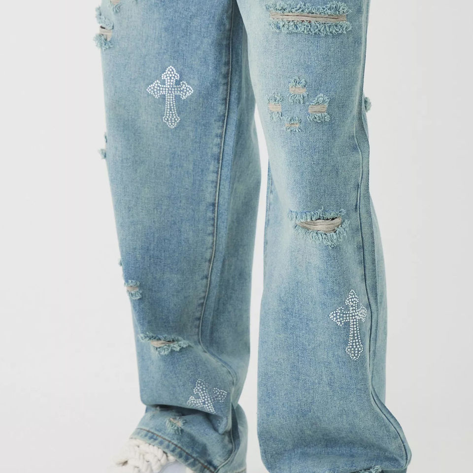 Veste en jean délavé clair, ample, déchirée, à jambes larges, style streetwear, ourlet effiloché, toile, cuir de vache, imperméable