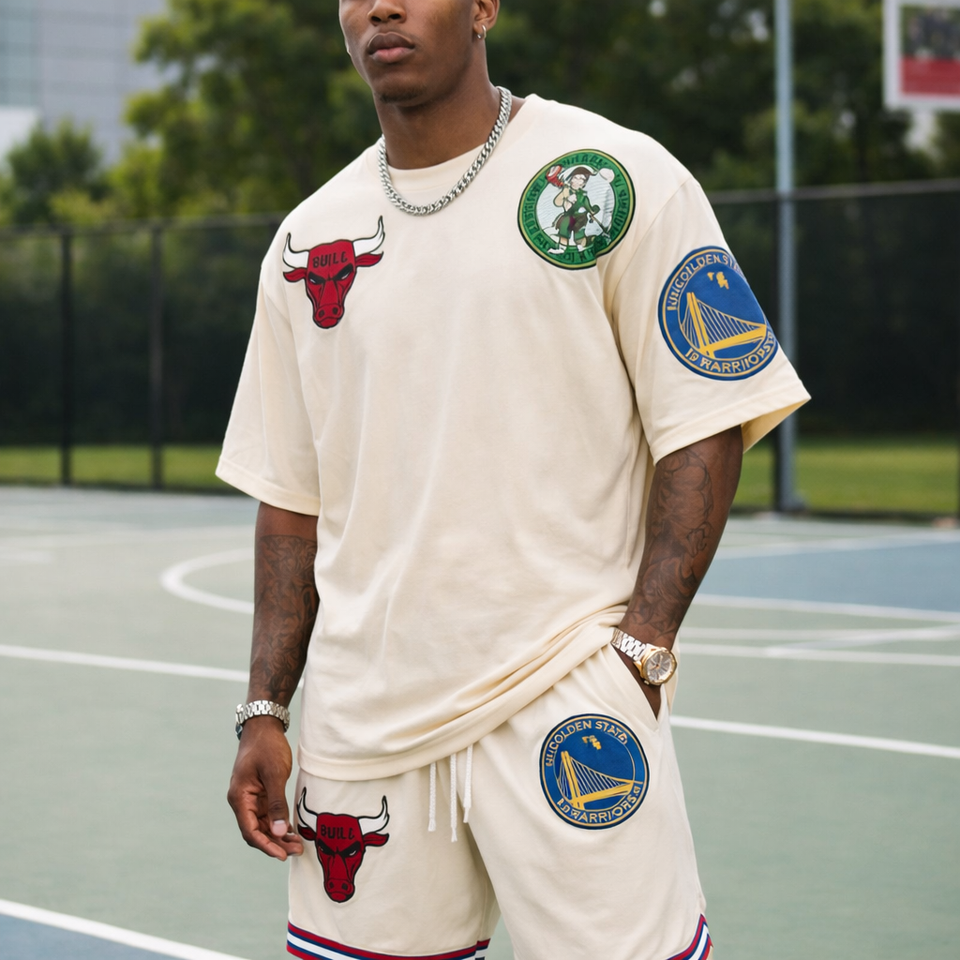 Ensemble coordonné de basketball oversize – Édition Street Performance pour homme en French Terry imprimé par transfert thermique, uni, délavé à l'acide, effet soleil éclairé