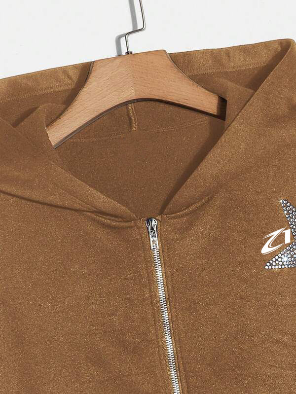 Sweat à capuche oversize marron avec étoile en strass, en molleton de coton, fermeture éclair intégrale, style streetwear, développement de vêtements personnalisés