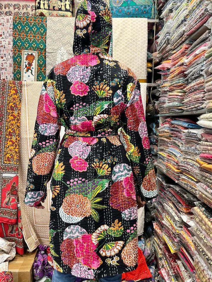 Surdimensionné Jungle Print Kantha Veste matelassée Kimono Robe longue à capuche Manteau chaud d'hiver pour le printemps et l'été