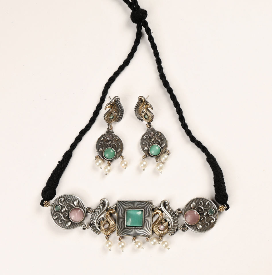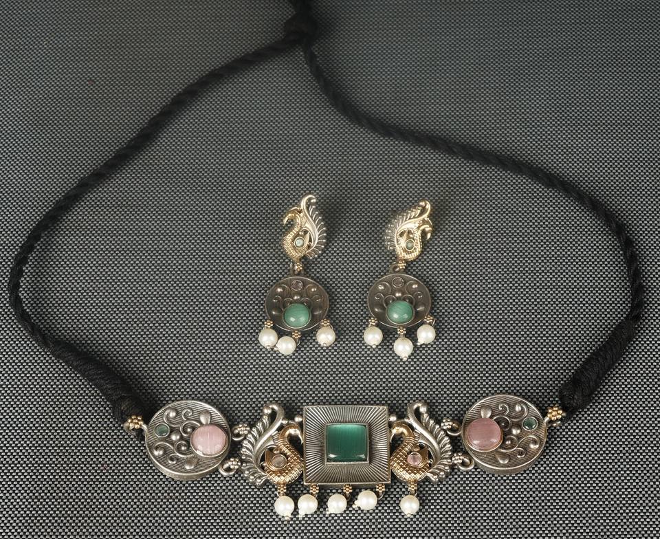 Nom ou mots:Tour de cou bicolore oxydé avec pierre verte