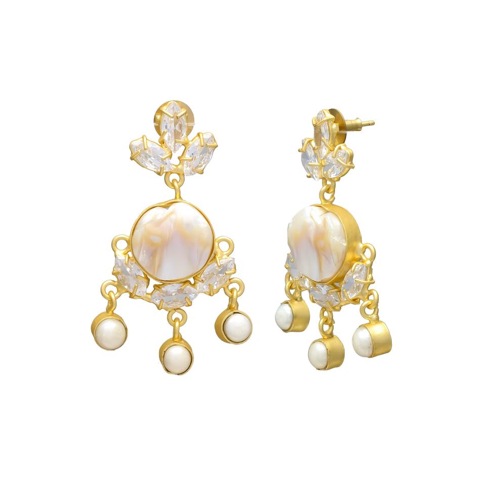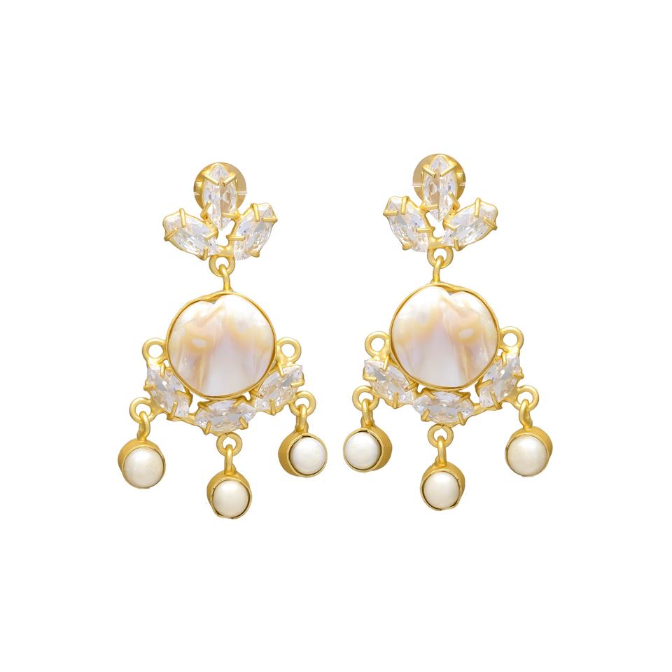 Oyster Mother Pearls Stud Earrings Women Vintage Wedding Bridal Accessory 24K Gold Plated Cubic Zirconia Everyday Brass