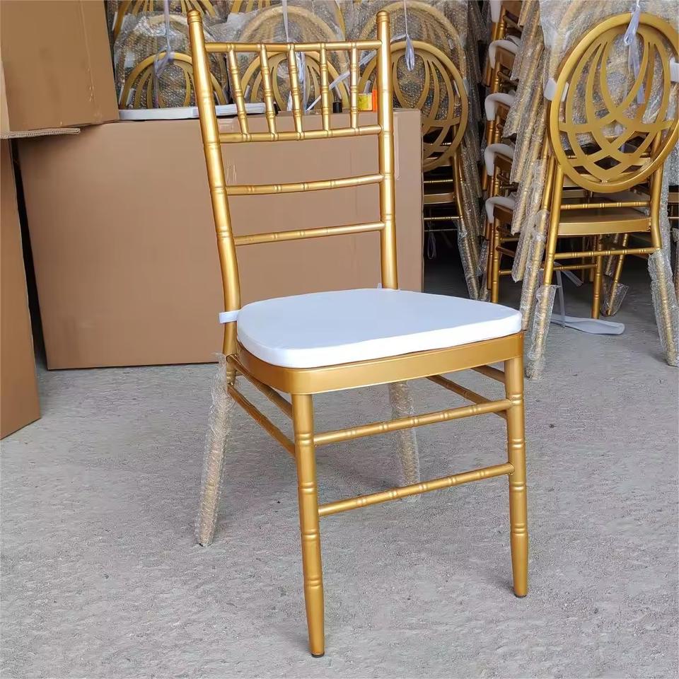 P Bon Prix En Gros En Plein Air De Noce Or Chaises Avec Coussin Blanc En Métal Empilable Banquet À Manger Chaise pour Événements