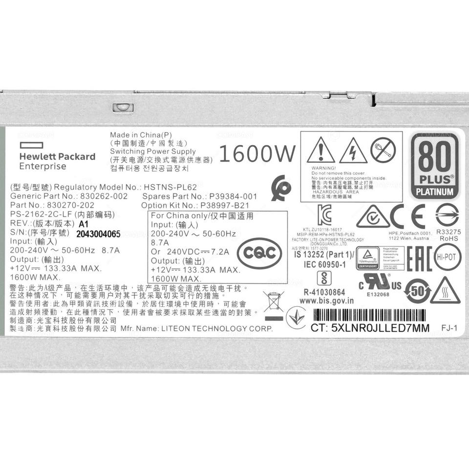 P39384-001 HP 1600W 94% POWER SUPPLY 80 PLUS PLATINUM FOR DL360 G10 DL380 G10 Refurbished