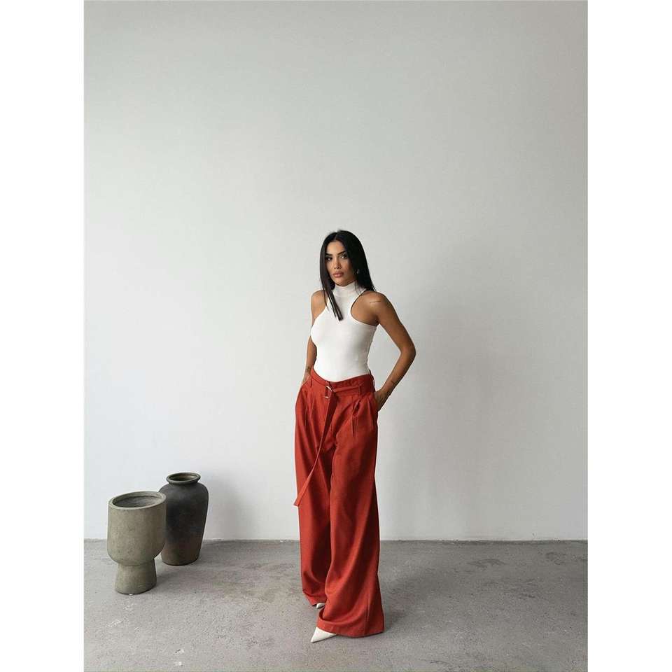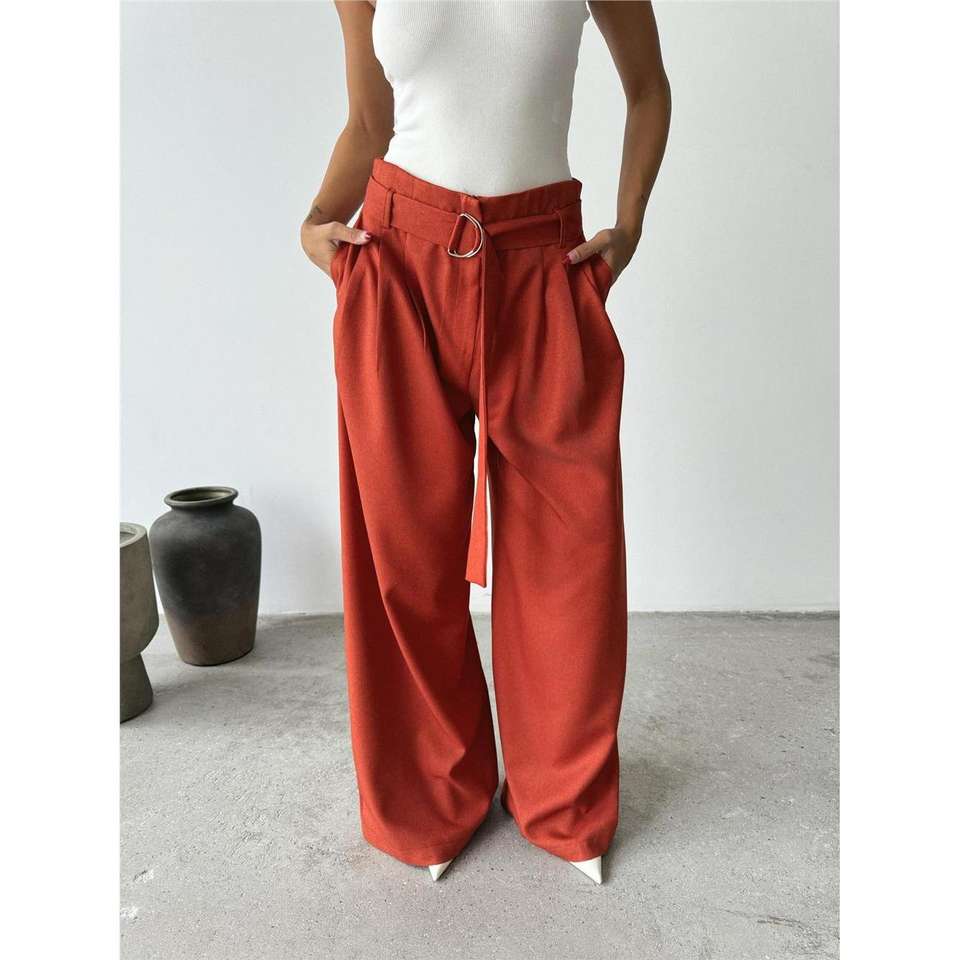 PALAZZO Pantalon cargo classique en toile, coupe palazzo évasée, respirant, taille mi-haute, couleur terre cuite, avec ceinture et fermeture élastique à la taille