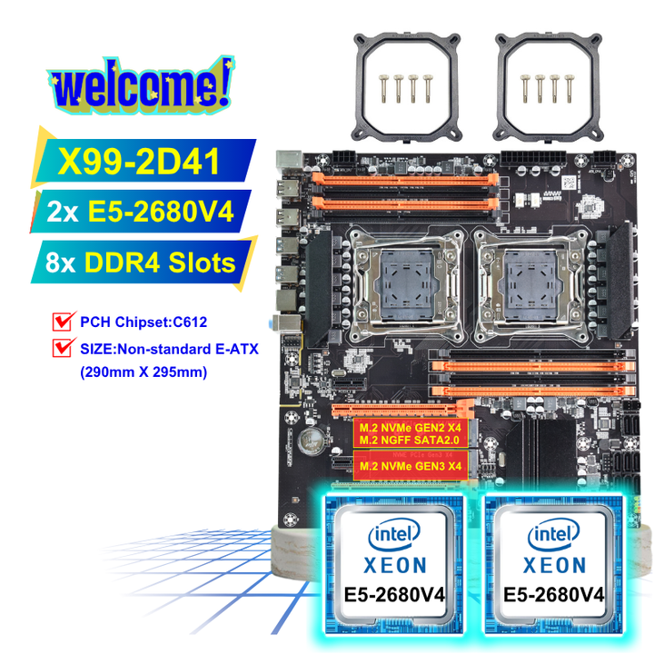 Nouvelle carte mère PANDL X99-2D41 E-ATX 8X DDR4 ECC RAM, ensemble Intel Dual Xeon E5 2680 V4, carte mère X99, combo double processeur, kit Xeon X99
